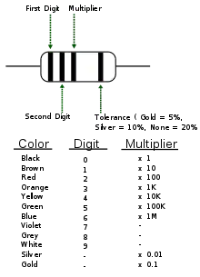 Les trois premiers cercles donnent la valeur de la résistance, avec un petit détail pour le troisième cercle. Les deux premiers cercles codent un nombre à deux chiffres : un chiffre par cercle. Le troisième cercle dit s'il faut multiplier le nombre précédent par 1, 10, 100, 1000, etc. Le coefficient de multiplication est une puissance de 10, dont l'exposant est égal au chiffre indiqué par le troisième cercle. Chaque couleur correspond à un chiffre, ou à un coefficient multiplicateur, suivant le code suivant :