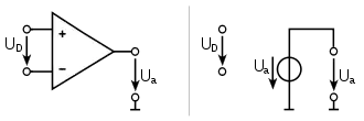 La présence de deux entrées s'explique par le fait qu'un AOP est ce que l'on appelle un amplificateur différentiel : il amplifie la différence entre deux tensions. Il prend les deux tensions d'entrée, soustrait la seconde à la première, et amplifie le résultat. Le coefficient d'amplification est appelé le gain différentiel de l'AOP, ou encore le gain en boucle ouverte. Si les deux tensions sont égales, l'AOP fournit une tension nulle, propriété appelée rejet du mode commun. Les tensions sur les deux broches d'entrée sont notées et , alors que la tension de sortie est notée . Pour un AOP, on a :