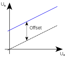 Un premier défaut est que, pour , la tension de sortie est non-nulle. La tension de sortie obtenue sous ses conditions, à savoir quand les deux entrées sont mises à la masse, est appelée la tension d'offset. Elle peut être positive ou négative : tout dépend de l'AOP utilisé. En temps normal, elle vaut entre 1 mV et 5 mV, guère plus. Elle a pour origine la structure interne de l'AOP, qui est composé de transistors et de composants passifs, qui sont loin d'être parfaits. Notons que la tension d'offset peut varier selon la température, ce qui fait qu'elle est souvent difficile à corriger via un circuit quelconque.