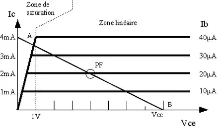La relation théorique entre Ic et Vce est illustrée dans le schéma ci-dessous. On voit bien la différence entre la zone linéaire et la zone de saturation. Dans la zone linéaire, Ic ne dépend que de Ib et pas de Vce : la courbe est donc "plate", signe de l'indépendance de Ic et de Vce. Par contre, dans la zone de saturation, le courant Ic augmente avec la tension VCE. Cette description est cependant assez schématique, du moins pour le fonctionnement de la zone linéaire.