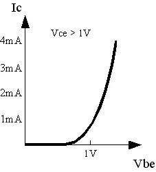 On a vu plus haut qu'il y a une jonction PN entre la base et l'émetteur. On devine donc que la relation entre Ib et Vbe est celle d'une jonction PN, celle d'une diode. Compte tenu de la relation entre Ic et Ib, on devine qu'il en est de même pour la relation entre Vbe et Ic. On a donc les équations suivantes, qui sont celles d'une diode :