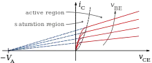 La tension VE de l'équation précédente est appelée la tension d'Early. Elle s'obtient en prolongeant le courant de saturation sur le graphe Ic/Vce. Un exemple est illustré ci-dessous.
