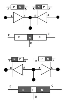 Vous aurez remarqué que les termes NPN et PNP font penser aux jonctions PN. Ce n'est pas un hasard : tout BJT est constitué de deux jonctions PN mises en série. Vu qu'une jonction PN est une diode, on peut considérer, à quelques détails près, qu'un transistor est composé de deux diodes mises en série dans des sens opposés.