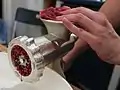 Un dénoyauteur permet de retirer le noyau des fruits (cerises notamment). Il est composé de deux branches dont l'une, accueillant le fruit, se termine par une forme hémisphérique avec un trou pour le passage du noyau, expulsé par la tige à l'extrémité de l'autre branche. |