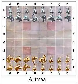 Arimaa est un jeu de plateau pour deux joueurs, pouvant être joué en utilisant un jeu d'échecs - un plateau de 8 × 8 est utilisé, et chaque joueur a seize pièces avec la même distribution qu'aux échecs. Le jeu Arimaa utilise des pièces or et argent représentant des animaux.