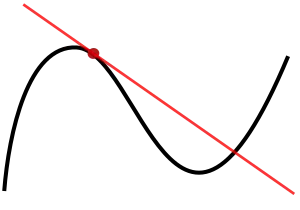 Soit une fonction de dans . On dit que est dérivable en lorsque le graphe de admet une tangente au point . Une tangente est une ligne droite "qui s'ajuste exactement, qui colle" à la courbe au point considéré :