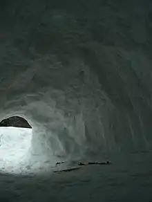 - On peut également, comme pour un igloo, construire un tunnel d'entrée pour réduire la pénétration d'air froid. La porte peut être fermée à l'aide d'une toile ou de blocs de neige.