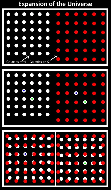 L'augmentation des distances liée au facteur d'échelle n'est pas très intuitive. Dans le monde réel, une expansion a un centre, un point central d'où s'éloignent les autres. Mais avec l'expansion de l'univers, ce n'est pas du tout le cas. Peu importe où l'on soit dans l'univers, tous les autres objets semblent s'éloigner de nous. Un habitant de la Terre verra toutes les galaxies lointaines s'éloigner de la Terre, mais un habitant de la galaxie d'Andromède verra lui aussi l'ensemble des galaxies s'éloigner de lui et non de la Terre ! C'est cette particularité qui fait que l'on doit recourir à un facteur d'échelle pour expliquer l'expansion.