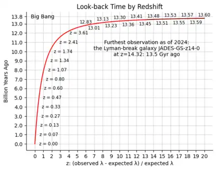 L'équation précédente permet de calculer quel temps temps s'est écoulé depuis qu'un photon a été émis, en fonction de son redshift. Pour cela, prenons l'équation précédente et isolons dt, en multipliant par . On obtient alors le temps dt qu'il faut pour obtnir un incrément de redshift dz.