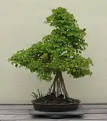 De plus, on peut leur donner des formes originales. Chaque fois qu'on le rempote (tous les 2-3 ans), il faut le replanter très peu profond : avec le haut des racines au-dessus du sol (mais en veillant à ce que l'essentiel de la motte racinaire soit bien enterrée). Après quelques années, la plante semble hors-sol, reposant sur ses racines aériennes. C'est proche du style Neagari de bonsaï (racines apparentes).