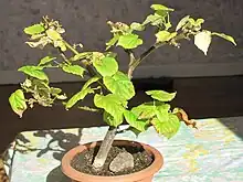 Si les feuilles du bonsaï sont de couleur vert clair avec les nervures de couleur vert plus foncé, c'est que l'arbre souffre de chlorose, c'est-à-dire d'un manque de fer. Utiliser des produits du commerce pour rétablir l'équilibre.