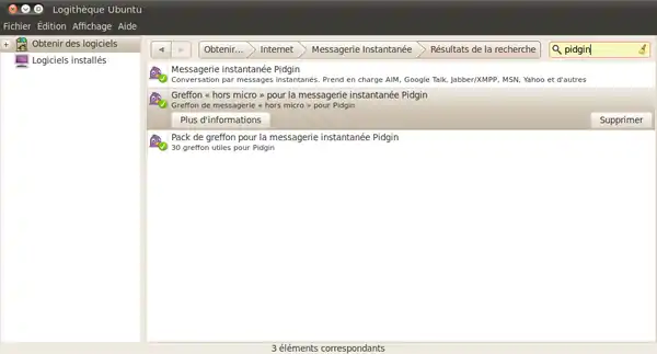 Plusieurs « modules complémentaires » permettent d'optimiser Pidgin. Ces modules ne sont disponibles que sur Ubuntu. Pour les installer, rendez-vous dans la Logithèque (accessible par Applications puis Logithèque Ubuntu). Sélectionnez Internet puis Messagerie instantannée et enfin entrez « Pidgin » dans la barre de recherche en haut à droite de l'écran.