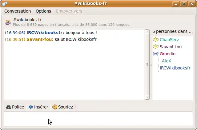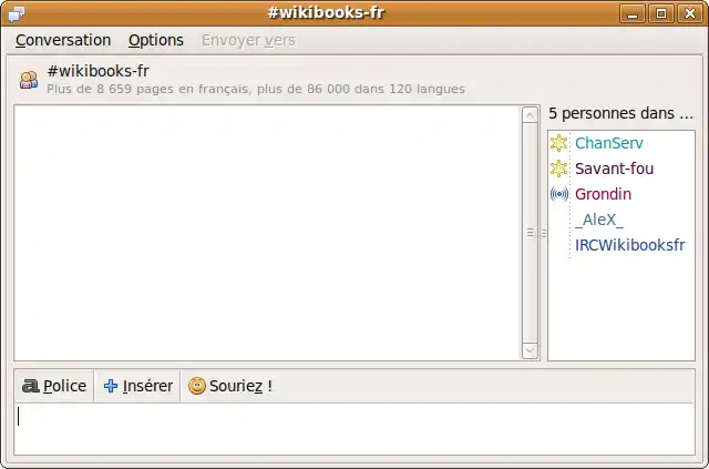 Vous remarquez que la fenêtre est composée de plusieurs parties : en bas, la zone d'entrée du message, au-dessus à gauche les messages récents et à droite la liste des personnes connectées. À côté d'elles, il peut y avoir différentes icônes, représentant un grade. L'étoile