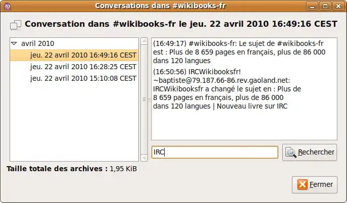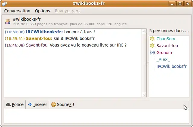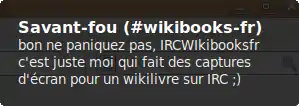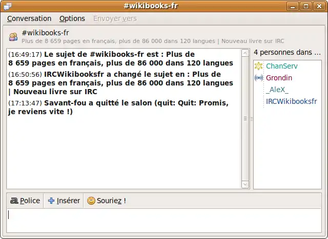 Enfin, lors de votre départ, vous pouvez soit fermer IRC soit entrer /quit suivi d'un message qui sera affiché à votre départ, par exemple : /quit Promis, je reviens vite !.