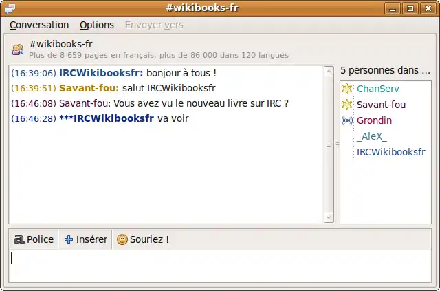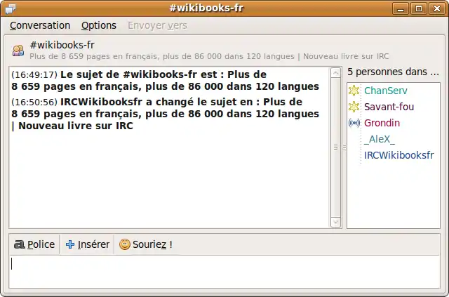 Si le canal est protégé par un mot de passe — ce qui n'est pas le cas de #wikibooks-fr et de la plupart des canaux — entrez le mot de passe à la suite : /join #channel motdepasse.
