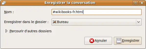 Vous pouvez exporter la conversation au format HTML (utilisé pour générer les pages web). Pour ceci, cliquez sur Conversation puis sur Enregistrer sous. Dans la fenêtre qui s'affiche, choisissez un nom, un dossier de destination et cliquez sur Enregistrer.