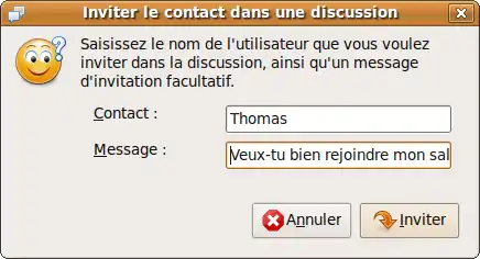 Pour proposer à un utilisateur de rejoindre votre salon, faites Conversation puis Inviter.