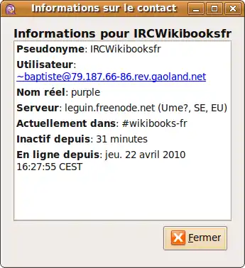 Pour afficher des informations sur un utilisateur, entrez /whois pseudo ou faites un clic droit sur l'utilisateur puis sélectionnez Infos. Si vous êtes dans votre liste de contacts, vous pouvez passer par Contacts puis Voir les informations ou Ctrl + I (dans ce cas vous devrez entrer le pseudonyme). Tous les chemins mènent à Rome et ces différentes voies donnent toutes la même chose :
