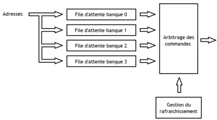 Une autre solution répartit les accès mémoire sur plusieurs banques en parallèle. Ainsi, on commence par servir la première requête de la banque 0, puis la première requête de la banque 1, et ainsi de suite. Cela demande de trier les requêtes de lecture ou d'écriture suivant la banque de destination, ce qui demande une file d'attente pour chaque banque.