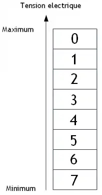 - Le codage numérique n'utilise qu'un nombre fini de valeurs, contrairement au codage analogique. Pour être plus précis, il code des informations en utilisant des nombres entiers, représentés par des suites de chiffres. Le codage numérique précise comment coder les chiffres avec une tension. Comme illustré ci-contre, chaque chiffre correspond à un intervalle de tension : la tension code pour ce chiffre si elle est comprise dans cet intervalle. Cela donnera des valeurs de tension du style : 0, 0.12, 0.24, 0.36, 0.48… jusqu'à 2 volts.