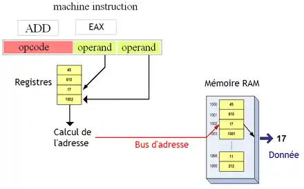 Il arrive que certaines instructions soient composées d'un opcode, sans rien d'autre : elles ont alors une représentation en binaire qui est unique. Mais certaines instructions ajoutent une partie variable, pour préciser la localisation des données à manipuler. Une instruction peut alors fournir au processeur ce qu'on appelle une référence, à savoir quelque chose qui permet de localiser une donnée dans la mémoire. Cette référence pourra ainsi préciser plus ou moins explicitement dans quel registre, à quelle adresse mémoire, à quel endroit sur le disque dur, se situe la donnée à manipuler. Elles indiquent où se situent les opérandes d'un calcul, où stocker son résultat, où se situe la donnée à lire ou écrire, à quel l'endroit brancher. Il faut préciser que toutes les références n'ont pas la même taille : une adresse utilisera plus de bits qu'un nom de registres, par exemple (il y a moins de registres que d'adresses). Par exemple, une instruction de calcul dont les deux références sont des adresse mémoire prendra plus de place qu'un calcul qui manipule deux registres.