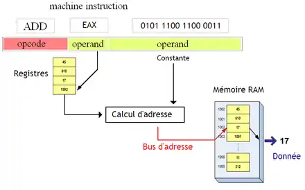 Reste à savoir quelle est la nature de la référence : est-ce une adresse, un nombre, un nom de registre ? Chaque manière d’interpréter la partie variable s'appellent un mode d'adressage. Pour résumer, un mode d'adressage indique au processeur que telle référence est une adresse, un registre, autre chose. Il est possible qu'une instruction précise plusieurs références, qui sont chacune soit une adresse, soit une donnée, soit un registre. Par exemple, une addition manipule deux opérandes, ce qui demande d'utiliser une opérande pour chaque (dans le pire des cas). Les instructions manipulant plusieurs références peuvent parfois utiliser un mode d'adressage différent pour chaque. Comme nous allons le voir, certaines instructions supportent certains modes d'adressage et pas d'autres. Généralement, les instructions d'accès mémoire possèdent plus de modes d'adressage que les autres, encore que cela dépende du processeur (chose que nous détaillerons dans le chapitre suivant).