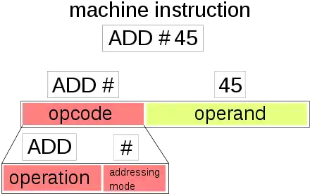 Une instruction n'est pas encodée n'importe comment et la suite de bits associée a une certaine structure. Quelques bits de l’instruction indiquent quelle est l'opération à effectuer : est-ce une instruction d'addition, de soustraction, un branchement inconditionnel, un appel de fonction, une lecture en mémoire, etc. Cette portion de mémoire s'appelle l'opcode. Pour la même instruction, l'opcode peut être différent suivant le processeur, ce qui est source d'incompatibilités. Par exemple, les opcodes de l'instruction d'addition ne sont pas les mêmes sur les processeurs x86 (ceux de nos PC) et les anciens macintosh, ou encore les microcontrôleurs. Ce qui fait qu'un opcode de processeur x86 n'aura pas d'équivalent sur un autre processeur, ou correspondra à une instruction totalement différente. De manière générale, on peut dire qu'il existe autant d'opcode que d'instructions pour un processeur. Évidemment, qui dit beaucoup d'opcodes dit processeur plus complexe : les circuits de gestion des opcodes sont naturellement plus complexes quand ces opcodes sont nombreuses. Pour l'anecdote, certains processeurs n'utilisent qu'une seule et unique instruction, et qui peuvent se passer d'opcodes.