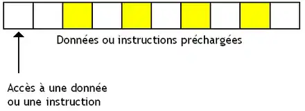 - Troisième solution : à chaque accès à un bloc de mémoire dans le cache, on charge le bloc de mémoire immédiatement suivant. Pour cela, on mémorise quelle est la dernière ligne de cache qui a été accédée. Cela se fait en marquant chaque ligne de cache avec un bit spécial, qui indique si cette ligne a été accédée lors du dernier cycle d'horloge. Ce dernier est automatiquement mis à zéro au bout d'un certain temps (typiquement au cycle d'horloge suivant). Le prefetcher se contente de charger le bloc qui suit la ligne de cache dont le bit vaut 1.