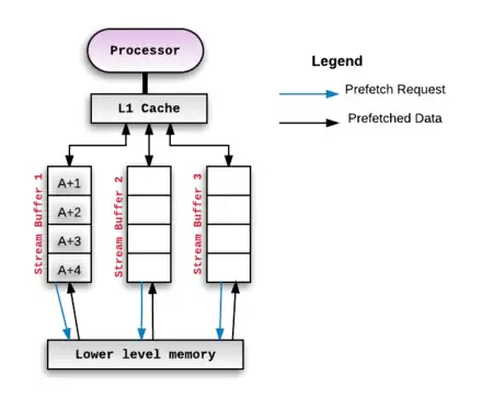 La toute première technique de ce genre est illustrée ci-dessous. Elle était pensée pour précharger des données dans le cache L1 d'un processeur, que ce soit pour précharger des données de la RAM dans le cache, ou pour précharger des données du cache L2 vers le cache L1. Mais cette technique s'adapte à toute forme de préchargement et à toute hiérarchie mémoire. On peut l'utiliser à tous les niveaux de la hiérarchie mémoire. Une version améliorée précharge les données dans le stream buffer non pas lors d'un défaut de cache, mais lors de chaque accès mémoire : tout accès à une donnée charge la donnée suivante dans le stream buffer. Mais nous en reparlerons plus bas, dans la section sur les évènements qui déclenchent le préchargement.