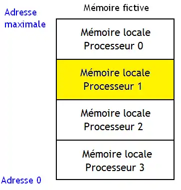 Avec une architecture distribuée de type NUMA, les processeurs voient un espace d'adressage global, qui contient les différentes mémoires locales. Lors des accès mémoire, les adresses utilisées sont des adresses de l'espace d'adressage global, de la totalité des mémoires. Si l'adresse est dans la mémoire locale du processeur, l'accès est direct. Dans le cas contraire, le système d'exploitation prend la relève et prépare une communication sur le réseau. Bien tirer parti de ces architectures demande de placer le plus possible les données en mémoire locale : l'idée est d'éviter les accès au réseau, qui sont lents.