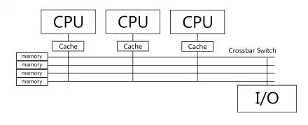 Pour les architectures qui ont au contraire un petit nombre de processeurs, on peut adapter l'architecture pour utiliser plusieurs mémoires partagées. Un exemple typique est celui où plusieurs processeurs sont reliés à plusieurs mémoires par l'intermédiaire d'un réseau de type crossbar. L'utilité de cette technique est de permettre un meilleur usage de la mémoire. Avec une mémoire partagée, tous les processeurs vont systématiquement accéder à la même mémoire. Mais en utilisant plusieurs mémoires séparées, les processeurs n'accéderont pas toujours à la même mémoire et il arrivera que deux processeurs distincts accèdent à deux mémoires différentes. Dans ce cas, les deux mémoires seront accédées en parallèle, les deux processeurs n'entreront pas en conflit pour l'accès à la mémoire. Cette technique ne supprime pas totalement les conflits d'accès à la mémoire, mais elle les réduit fortement. Par contre, le temps d'accès à la mémoire est augmenté, le réseau d'interconnexion entre processeur et mémoire ajoutant un délai non-négligeable.