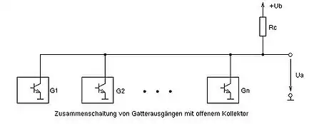 Les sorties à drain/collecteur ouvert sont plus limitées et ne peuvent prendre que deux états. Dans le cas le plus fréquent, la sortie est soit déconnectée, soit mise à 0 par le circuit intégré, mais elle ne peut pas être mise à 1 sans intervention extérieure. Pour compenser cela, le bus est relié à la tension d'alimentation à travers une résistance, appelée résistance de rappel. Cela garantit que le bus est naturellement à l'état 1, du moins tant que les sorties des composants sont déconnectées. Au repos, quand les composants n’envoient rien sur le bus, les sorties des composants sont déconnectées et les résistances de rappel mettent le bus à 1. Mais quand un seul composant met sa sortie à 0, cela force le bus à passer à 0.