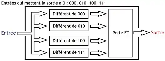 Ainsi, on sait que le nombre envoyé en entrée est égal à la constante k si et seulement si tous les bits sont à 1 en sortie de la couche de portes NON. Dit autrement, la sortie du circuit doit être à 1 si et seulement si tous les bits en sortie des portes NON sont à 1 : il ne reste plus qu'à trouver un circuit qui prenne ces bits en entrée et ne mette sa sortie à 1 que si tous les bits d'entrée sont à 1. Il existe une porte logique qui fonctionne ainsi : il s'agit de la porte ET à plusieurs entrées.