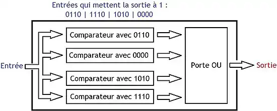 On peut créer n'importe quel circuit à une seule sortie avec ces comparateurs, en les couplant avec une porte OU à plusieurs entrées. Pour comprendre pourquoi, rappelons que les entrées du circuit peuvent prendre plusieurs valeurs : pour une entrée de bits, on peut placer valeurs différentes sur l'entrée. Mais seules certaines valeurs doivent mettre la sortie à 1, les autres la laissant à 0. Les valeurs d'entrée qui mettent la sortie 1 sont aussi appelées des minterms. Ainsi, pour savoir s’il faut mettre un 1 en sortie, il suffit de vérifier que l'entrée est égale à un minterm. Pour savoir si l'entrée est égale à un minterm, on doit utiliser un comparateur avec une constante pour chaque minterm. Par exemple, pour un circuit dont la sortie est à 1 si son entrée vaut 0000, 0010, 0111 ou 1111, il suffit d'utiliser :