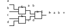Les équations obtenues ont une forme similaire aux exemples qui vont suivre. Ces exemples sont donnés pour un circuit à trois entrées nommées a, b et c, et une sortie s. On voit que certaines entrées sont inversées avec une porte NON, et que le résultat de l'inversion est ensuite combiné avec des portes ET et OU.