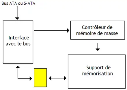 L'intérieur d'un disque dur contient beaucoup de composants. Comme toutes les mémoires de masse, il contient un support de mémorisation, un contrôleur de disque, et un contrôleur de bus.