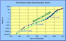 Mais la taille des plateaux ne fait pas tout : il faut aussi prendre en compte le nombre de bits par centimètre carré de surface magnétique, aussi appelée densité surfacique. La capacité des plateaux a augmenté progressivement au cours du temps, à un rythme différent suivant l'époque. Avant 1988, la densité surfacique augmentait de 30% par an, ce qui doublait la capacité des HDD tous les 3 ans. Entre 1996 et 2003, la densité de surface augmentait de 60% par an, avant d'atteindre un rythme de 100% par an depuis 2003.