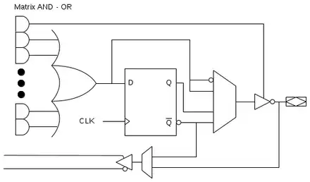 La plupart des PLD récents ajoutent un registre sur leur sortie. Pour cela, en aval de chaque porte OU, on trouve une bascule D qui mémorise la sortie du circuit PLD. Le PLD est un circuit imprimé, qui a une sortie pour chaque porte OU, mais cette sortie n'est pas toujours connectée directement à la sortie de la bascule. La raison est qu'on trouve un MUX qui permet de choisir si on veut récupérer soit le contenu de la bascule, soit la sortie directe de la porte OU. La plupart des PLD ajoutent aussi la possibilité de prendre l'inverse de chaque sortie. Le tout est configuré par quelques bits d'entrée.
