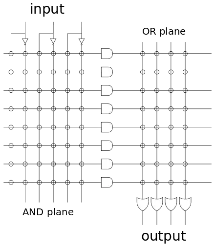 Avec une mémoire PROM, la matrice ET est fixée une fois pour toute. L'ensemble matrice ET + portes ET + portes NON forme un simple décodeur, aux sorties à collecteur ouvert. La couche de portes OU peut faite de portes OU câblées, mais ce n'est pas systématique.