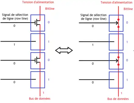 Suivant la mémoire, ce connecteur peut être un transistor, ou un fusible. Dans le premier cas, chaque transistor fonctionne soit comme un interrupteur ouvert, soit comme un interrupteur fermé. Un 1 correspond à un transistor laissé intact, qui fonctionne comme un interrupteur ouvert. Par contre, un 0 correspond à un transistor grillé, qui se comporte comme un interrupteur fermé. Dans le cas avec les fusibles, chaque bit est stocké en utilisant un fusible : un 1 est codé par un fusible intact, et le zéro par un fusible grillé. Une fois le fusible claqué, on ne peut pas revenir en arrière : la mémoire est programmée définitivement.