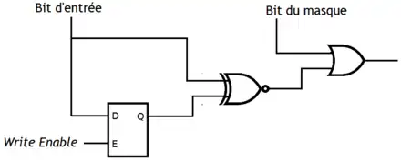 Sur les CAM avec masquage fournit en entrée, les bits sélectionnés pour la comparaison sont précisés par un masque, un nombre de la même taille que les cases mémoires. Le masque est envoyé à la mémoire via un second bus, séparé du bus de données. Le masque est alors appliqué à toutes les cases mémoires. Notons que si le contenu d'une cellule n'est pas à prendre en compte, alors le résultat de l'application du masque doit être un 1 : sans cela, la porte ET à plusieurs entrées (ou son remplacement) ne donnerait pas le bon résultat. Pour implémenter ce comportement, il suffit de rajouter un circuit qui prend en entrée : le bit du masque et le résultat de la comparaison. On peut établir la table de vérité du circuit en question et appliquer les méthodes vues dans le chapitre sur les circuits combinatoires, mais le résultat sera dépend du format du masque. En effet, deux méthodes sont possibles pour gérer un masque.