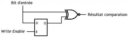 La comparaison de deux bits est un problème des plus simples. Rappelons que nous avions vu dans le chapitre sur les comparateurs qu'un comparateur qui vérifie l"égalité de deux bits n'est autre qu'une porte NXOR. Ce faisant, dans leur implémentation la plus naïve, chaque cellule CAM incorpore une porte NXOR pour comparer le bit d'entrée avec le bit mémorisé. Une cellule CAM ressemble donc à ceci :