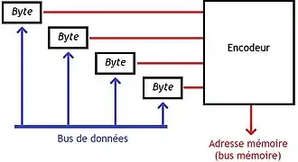 Une fois la case mémoire qui contient la donnée identifiée, il faut déduire son adresse. Si vous regardez bien, le problème qui est posé est l'exact inverse de celui qu'on trouve dans une mémoire adressable : on n'a pas l'adresse, mais les signaux sont là. La traduction va donc devoir se faire par un circuit assez semblable au décodeur : l'encodeur. Dans le cas où la donnée est présente en plusieurs exemplaires dans la mémoire, la solution la plus simple est d'en sélectionner un seul, généralement celui qui a l'adresse la plus petite (ou la plus grande). Pour cela, l'encodeur doit subir quelques modifications et devenir un encodeur à priorité.