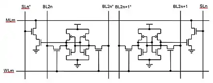 Il est cependant possible d'optimiser le tout pour réduire les circuits de comparaison, en travaillant directement au niveau des transistors. On peut notamment s'inspirer des méthodes vues pour les cellules CAM normales, avec une organisation de type NAND ou NOR. Une telle cellule demande 2 bascules SRAM, ce qui fait 2 × 6 = 12 transistors. Il faut aussi ajouter les circuits de comparaison, ce qui rajoute 4 à 6 transistors. Un défaut de cette approche est qu'elle augmente la taille de la cellule mémoire, ce qui réduit donc la densité de la mémoire. La capacité de la mémoire CAM s'en ressent, car les cellules CAM sont très grosses et prennent beaucoup de transistors. Les cellules CAM de ce type les plus optimisées utilisent entre 16 et 20 transistors par cellules, ce qui est énorme comparé aux 6 transistors d'une cellule SRAM, déjà assez imposante. Autant dire que les mémoires de ce type sont des plus rares.
