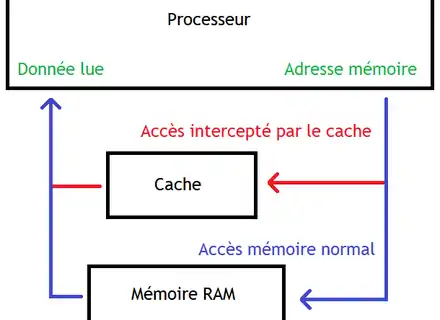 Le cache est une mémoire intercalée entre la mémoire et un processeur ou un périphérique, qui est souvent fabriquée avec de la mémoire SRAM, parfois avec de l'eDRAM. Sans lui, on se croirait à l'âge de pierre tellement nos PC seraient lents ! En effet, la mémoire est lente comparée au processeur. Or, le temps mis pour accéder à la mémoire est du temps durant lequel le processeur n’exécute pas d'instruction (sauf cas particuliers impliquant un pipeline). Il a fallu trouver une solution pour diminuer ce temps d'attente, et on a décidé d'intercaler une mémoire entre le processeur et la mémoire. Comme cela, le processeur accède directement à une mémoire cache très rapide plutôt que d'accéder à une mémoire RAM qui répondra de toute façon trop tard.