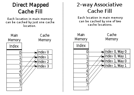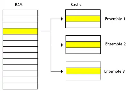 Le schéma ci-dessous compare un cache directement adressé et un cache associatif à deux voies. On voit que chaque adresse est associée à une ligne de cache bien précise avec un cache directement dressé, et à deux lignes de cache avec un cache associatif à deux voies. L'adresse sera associée à 4 lignes de cache sur un cache associatif à 4 voies, à 8 lignes pour un cache à 8 voies, etc. L'ensemble des lignes de cache associées à une adresse est appelé un ensemble.