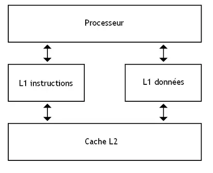 Sur certains processeurs, il y a deux caches L1 séparés : un cache d'instructions, dédié aux instructions, et un autre pour les données. Les deux caches sont reliés au reste du processeur, ainsi qu'au cache L2. Pour les liaisons avec le processeur proprement dit, il y a un bus séparé pour le cache d'instruction et un autre pour le cache de données. Une telle organisation permet de charger une instruction tout en lisant une donnée en même temps. C'est théoriquement possible avec un cache L2 multiport, mais l'usage de caches séparés est plus simple. Pour les connexions avec le cache L2, tout dépend du processeur. Certains utilisent un cache L2 multiport, qui permet aux deux caches L1 de lire ou écrire dans le cache L2 simultanément.