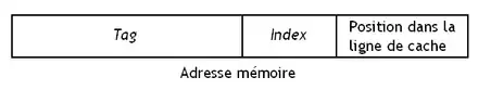 Plus haut, nous avions dit que le cache mémorise, pour chaque ligne de cache, l'adresse RAM associée. Le cache contient donc des paires adresse-ligne de cache qui lui permettent de faire le lien entre ligne de cache et adresse. Mais du fait de l'organisation du cache en lignes de cache de grande taille, qui sont de plus alignées en mémoire, il faut nuancer cette affirmation. Le cache ne mémorise pas la totalité de l'adresse, ce qui serait inutile. L'alignement des lignes de cache en RAM fait que les bits de poids faible de l'adresse ne sont pas à prendre en compte pour l'association adresse-ligne de cache. Dans ces conditions, on mémorise seulement la partie utile de l'adresse mémoire correspondante, qui forme ce qu'on appelle le tag.