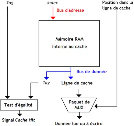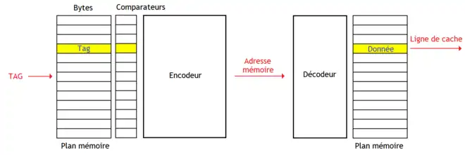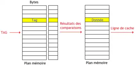 Le cache est donc une grande table de correspondance entre tags et lignes de cache. Lors d'un accès mémoire, le cache extrait le tag de l'adresse à lire ou écrire, et le compare avec les tags de chaque ligne de cache. Si une ligne contient ce tag, alors c'est que cette ligne correspond à l'adresse, et c'est un défaut de cache sinon. Lors d'un succès de cache, la ligne de cache est lue depuis le cache et envoyée à un multiplexeur qui sélectionne la donnée à lire dans la ligne de cache. Le fonctionnement est similaire pour une écriture : la donnée à écrire passe dans un démultiplexeur, qui envoie la donnée au bon endroit dans la ligne de cache sélectionnée.