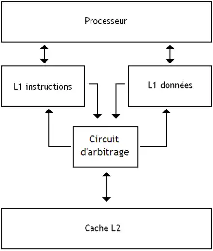 Si le cache L2 ne gère pas les accès simultanés, il n'y a qu'un seul bus relié aux caches L1 et au cache L2. On doit effectuer un arbitrage pour décider quel cache a la priorité, chose qui est réalisé par un circuit d'arbitrage spécialisé.